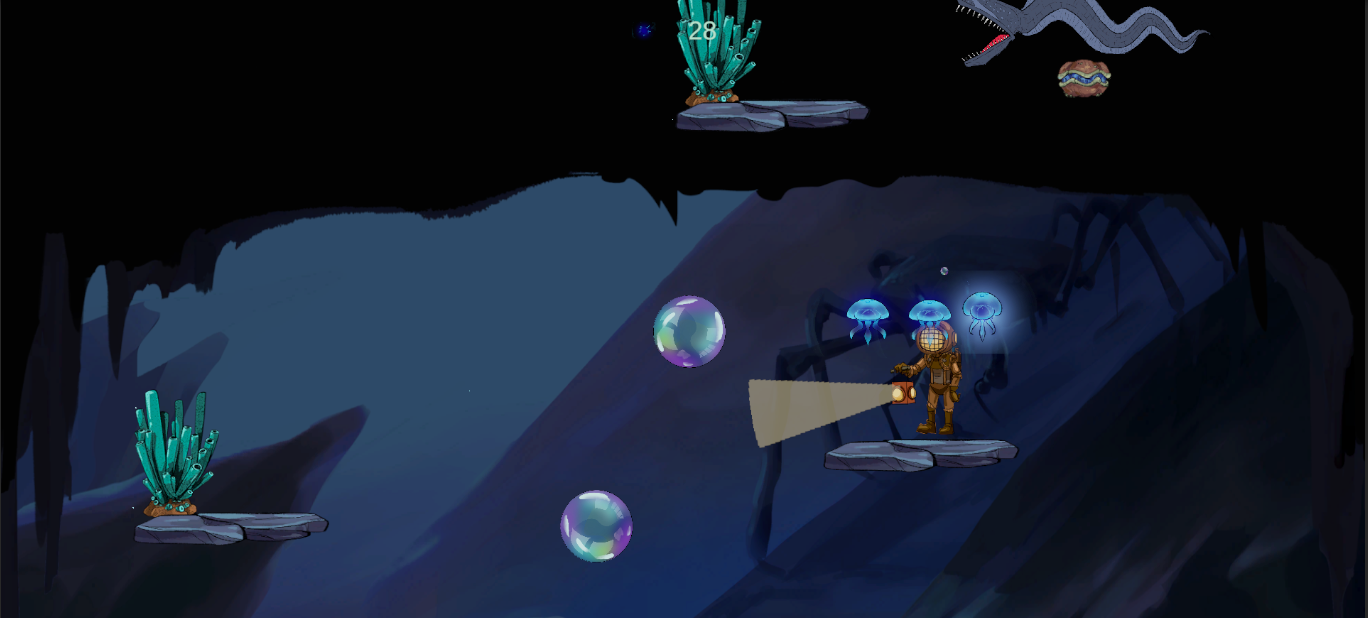 We are Les Inséparables, a team from Brassart School in Aix-en-Provence composed of : LINARES Ilana, RIVALS Hugo, GARCIA Romain et GRAY Raphaëlle for the Game Designer team and of BERTRAND Estelle, PAILLAT Romane, BARON Doriane, ABT Cassandre, BECKER Léo, GUIEUX Fanny, BIANCO Carla, REMPLAKOWSKI Camille for the Art Team. For this Game Jam we had two days, during which we developed a video game based on the theme “Under Pressure.” To interpret this theme, we chose a maritime universe inspired by deep-sea diving and the increasing pressure of the ocean depths. Abyss follows a deep-sea diver whose goal is to descend as far as possible without being killed by hostile sea creatures or crushed by the growing pressure. To survive, the player uses a lamp that can be charged to unleash a concentrated beam of light capable of eliminating enemies. Defeated creatures drop bubbles, which act as currency and can be spent on upgrades in the in-game shop available in the game’s main menu. However, the lamp’s battery drains if overused. Players must collect plasma orbs scattered throughout the depths to recharge it. On the development side, the Art team created the game’s backgrounds using multiple layered assets. This allowed us to implement a parallax effect in-engine, enhancing the sense of depth and immersion. Meanwhile, the Game Design team divided responsibilities between development, playtesting, balancing, and level design. We also implemented procedural map generation: levels are built from the concept art created by the art team and are randomly assembled to provide a fresh experience with each playthrough.
